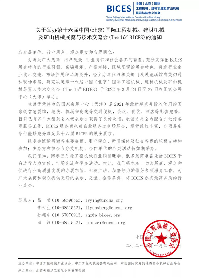 关于举办第十六届中国(北京)国际工程机械、建材机械及矿山机械展览与技术交流会(The 16th BICES)的通知